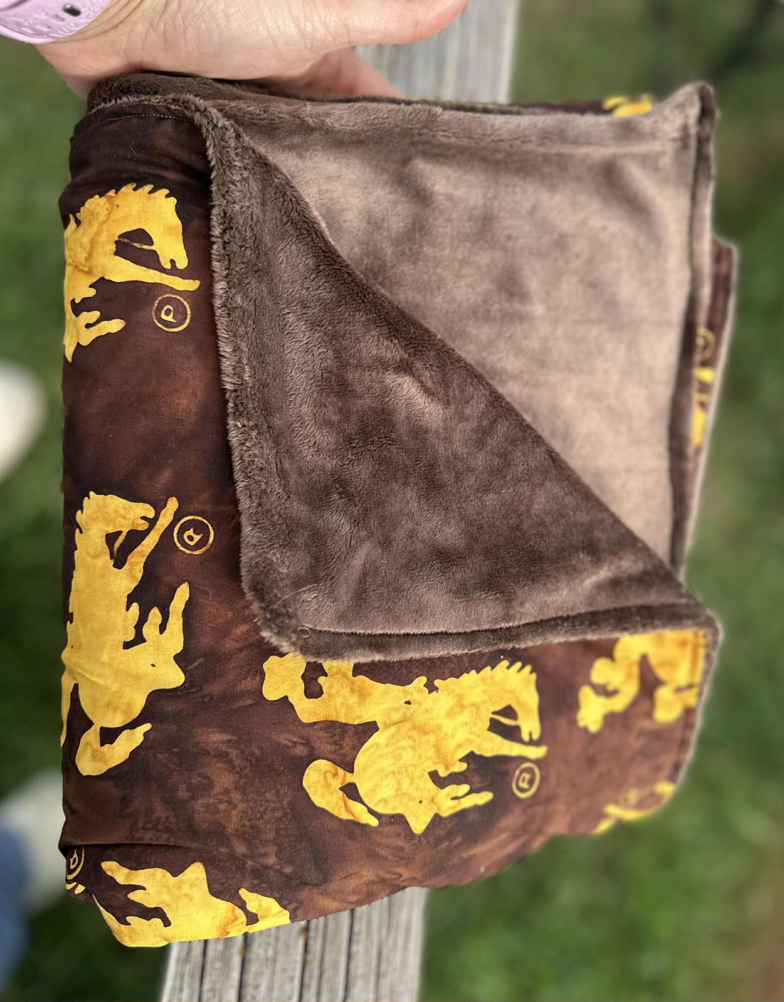 - Double-sided design: licensed Wyoming Cowboys fabric meets luxurious minky